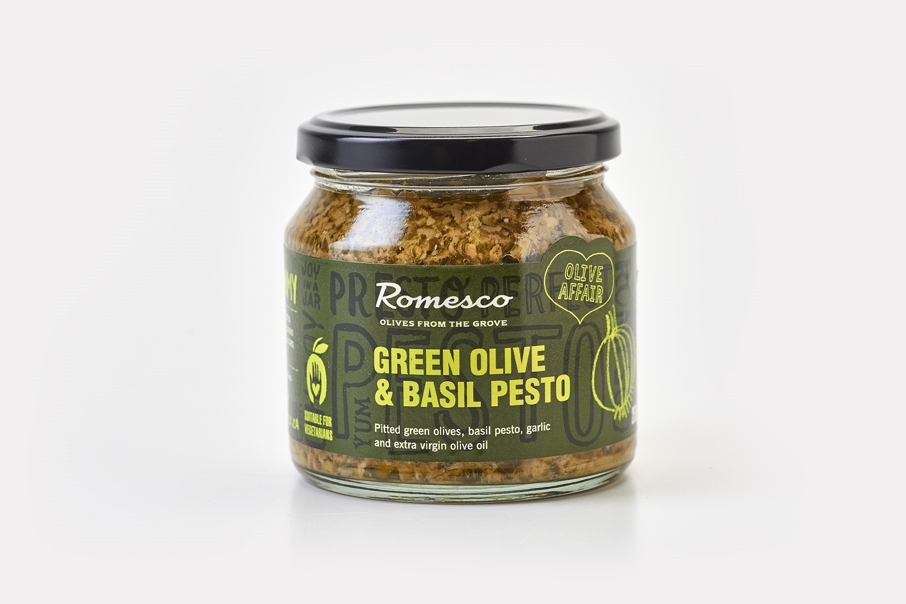 Pitted Green Olives, Basil Pesto, White Balsamic Vinegar, fresh Garlic and Extra Virgin Olive Oil.