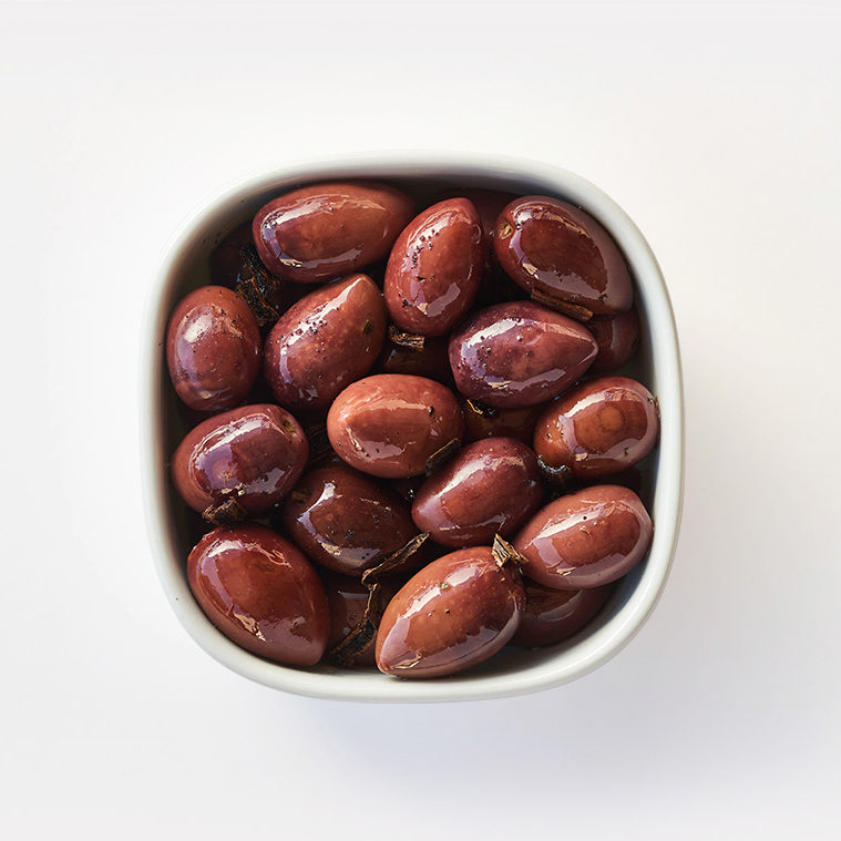 Smokey Kalamata Olives, steeped in Extra Virgin Olive Oil.